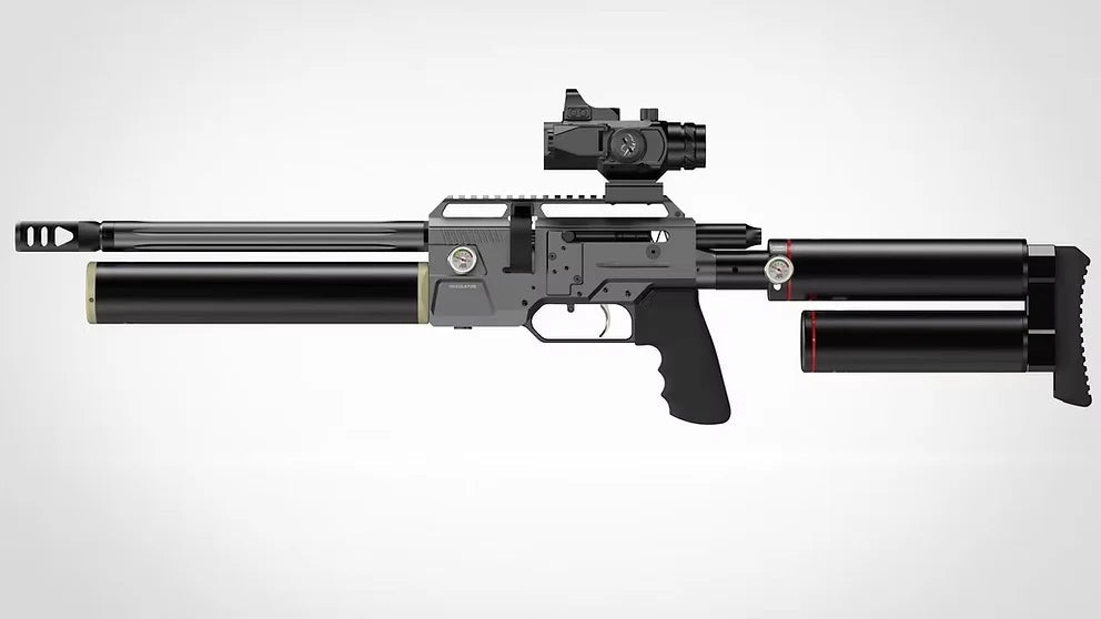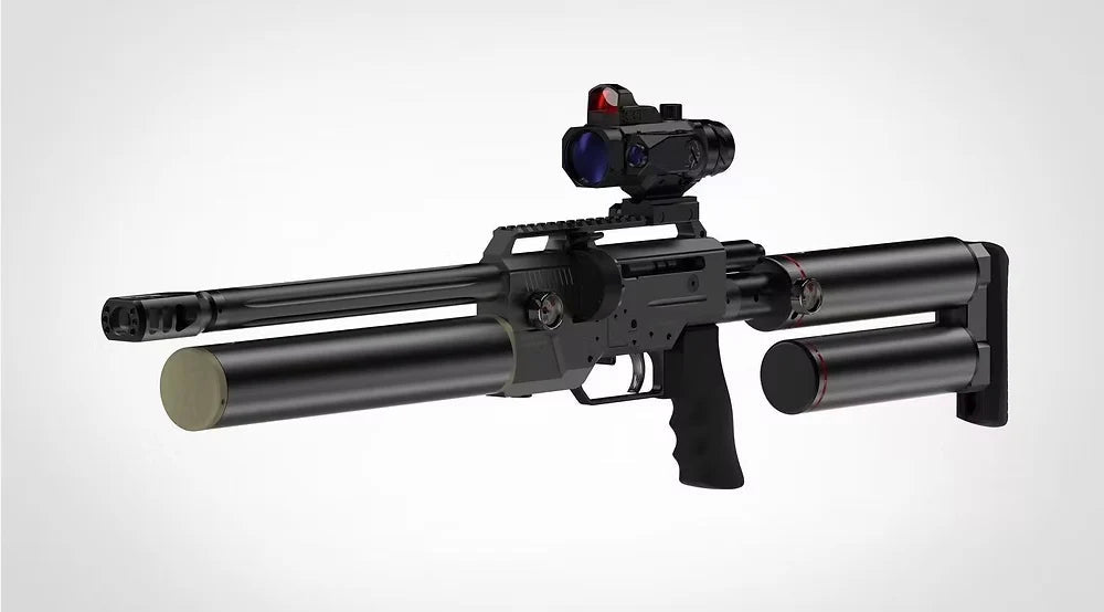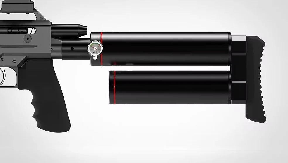 This pre-charged pneumatic (PCP) air rifle boasts an incredible 800+ fps muzzle velocity with 200-grain ammunition, delivering a staggering 406 Joules / 300+ Foot Pounds Energy (FPE). The .45 caliber (11.43mm) BIG BORE features a 6-shot magazine, integrated shroud silencer, and muzzle brake for quiet precision. The 800CC combined air tubes, 7000 PSI max fill pressure. Equipped with a sight rail, it sports a 13-inch barrel. The overall length measures 36 inches with a weight of 11 pounds. Enjoy Featuring a cheek riser (available on Original model). Accessories include 2 detachable CNC magazines and a fill probe. Backed by a one-year limited manufacturer's warranty.