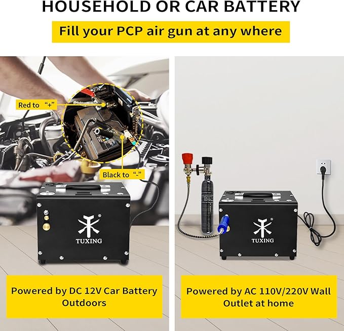 TUXING PCP Air Compressor, Auto-shutoff 4500Psi/30Mpa Oil/Water-Free Set-pressure Air Gun with Water/Oil Separator, Built-in Power Adapter (110V AC or 12V Car Battery)